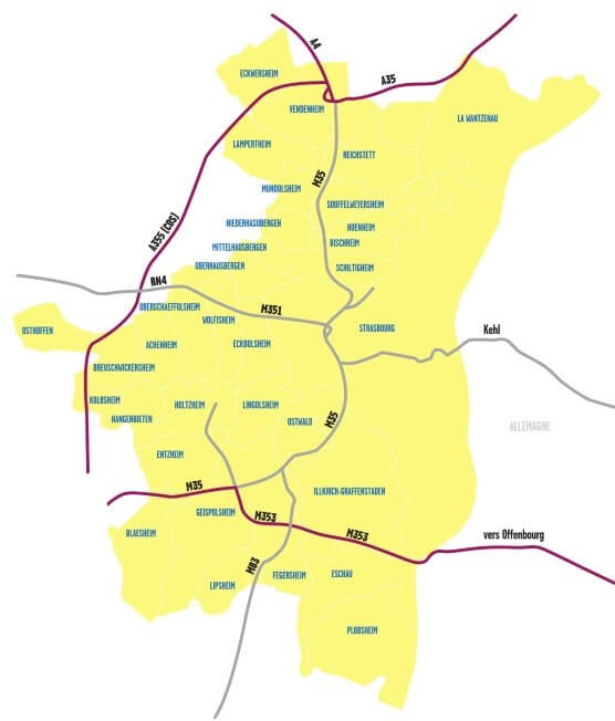 La zona de bajas emisiones de Estrasburgo incluye los 33 municipios de la región. Las restricciones no afectan a las carreteras principales A4, A35, N83, N353 y D1083.